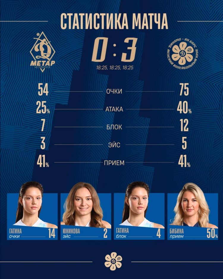 В очередном матче чемпионата женской волейбольной Суперлиги казанский клуб «Динамо-Ак Барс» уверенно обыграл челябинский клуб «Динамо-Метар» с итоговым счетом 3:0. Это уже шестая победа подряд для казанских волейболисток.