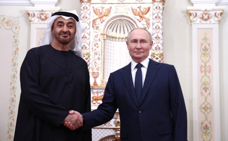 Президент ОАЭ прибыл в Россию с официальным визитом накануне. В понедельник оба лидера посетили гимназию имени Е. М. Примакова в Московской области.