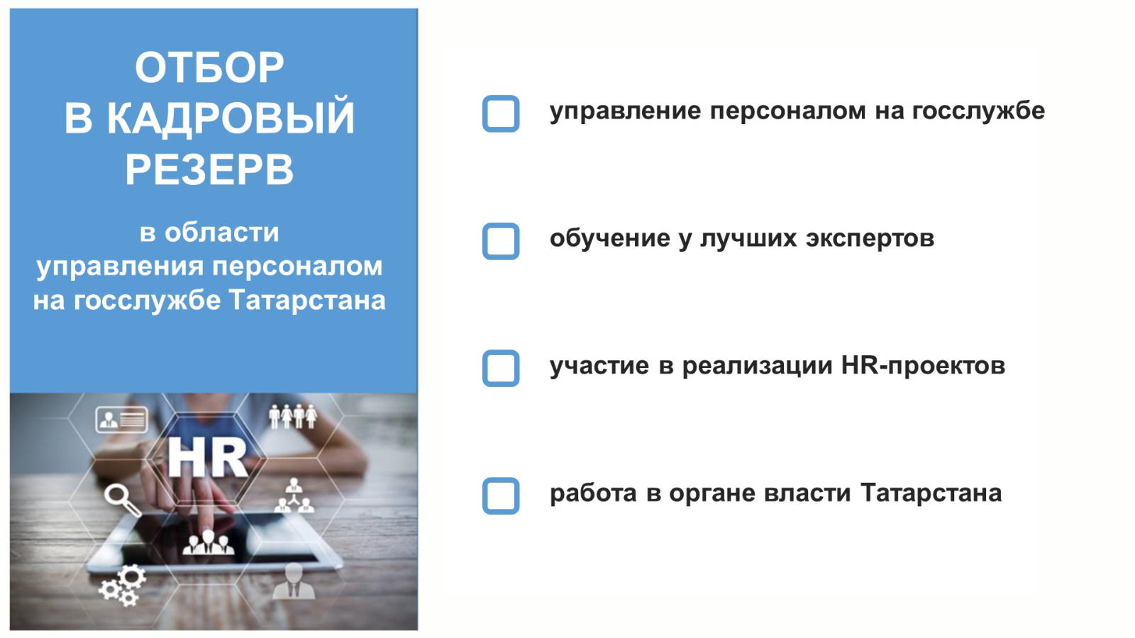 Победители конкурса будут включены в кадровый резерв Республики Татарстан и смогут рассматриваться на должности руководителей и специалистов кадровых служб. Для отобранных резервистов предусмотрены специализированные программы обучения и стажировка в государственных органах республики.