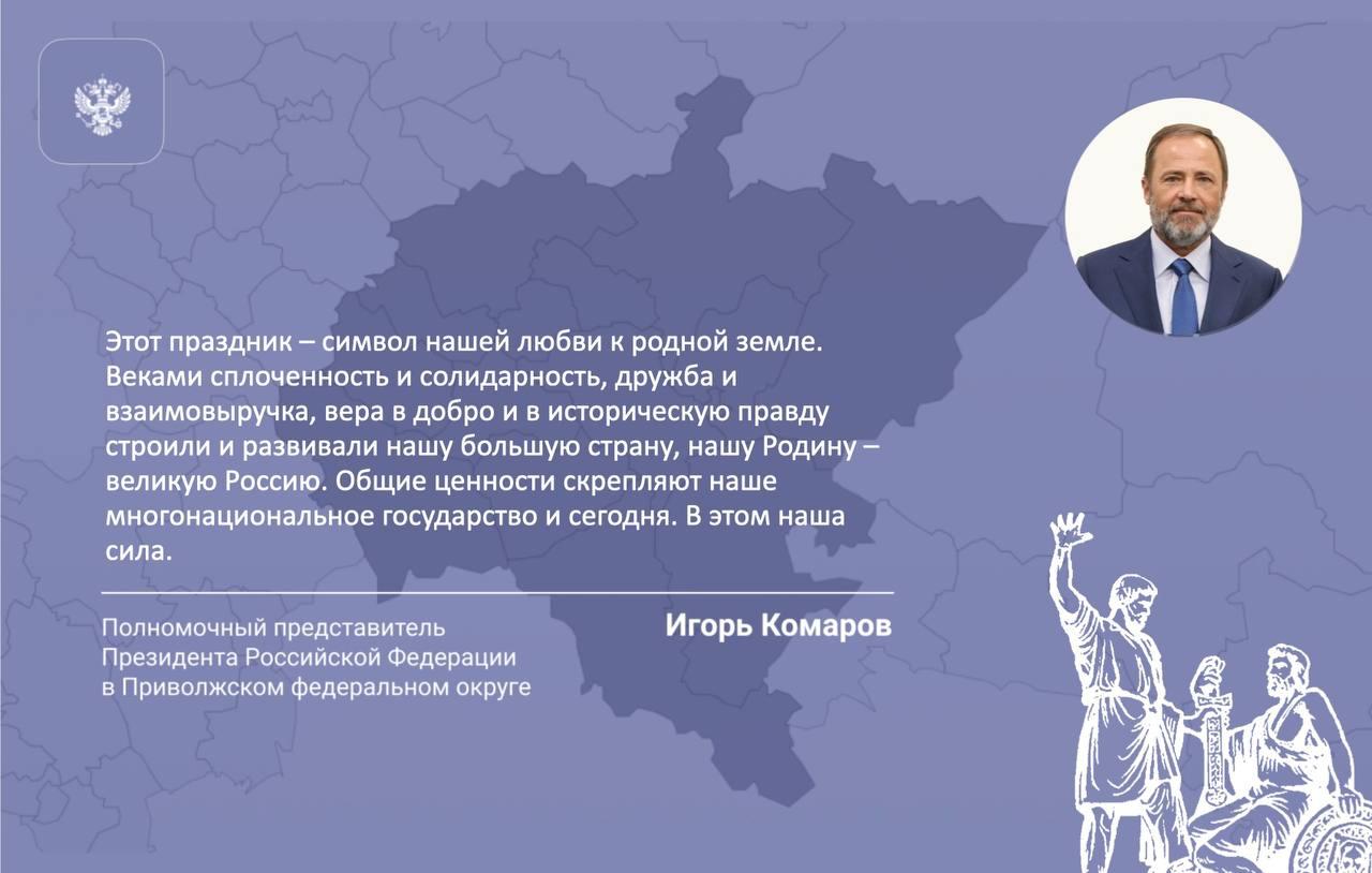 Полномочный представитель Президента России в ПФО Игорь Комаров поздравил жителей округа с Днем народного единства, отметив, что этот праздник символизирует любовь к родной земле. Он подчеркнул важность сплоченности и солидарности, которые на протяжении веков способствовали развитию России.