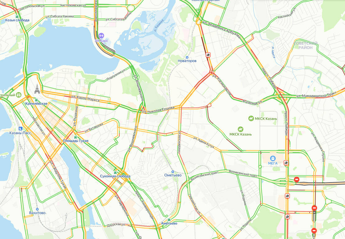 Заторы наблюдаются на Мамадышском и Вознесенском трактах, проспекте Победы, улице Ю. Фучика и других. Проблемы с движением также возникли на Сибирском тракте из-за ДТП.