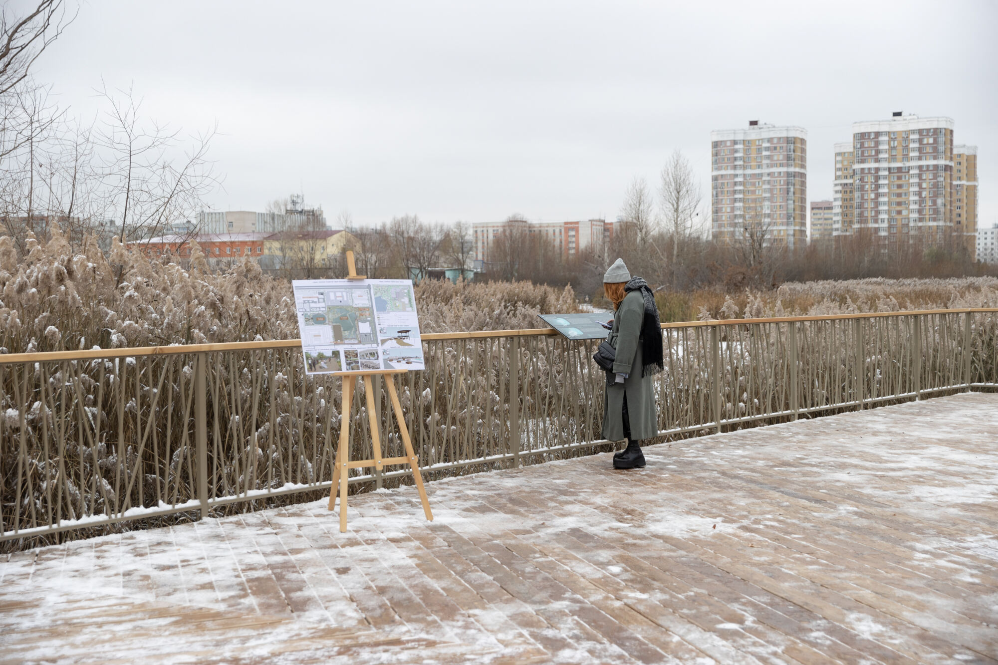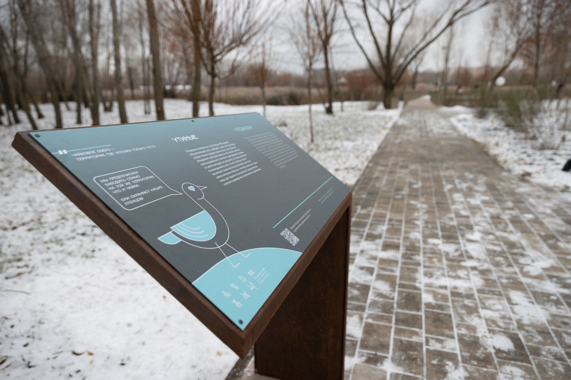 На дорожках общей площадью 1,8 тыс. кв.м уложена плитка, освещение организовано с использованием ламп теплого света. Установлены смотровые площадки с деревянным настилом для наблюдения за местной фауной и информационные стенды о животных.