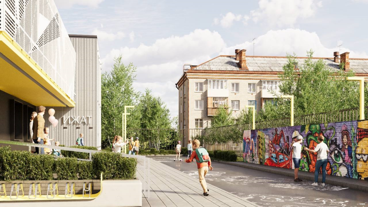 Валеева отметила, что архитекторы придерживались идеи «детское — не значит разноцветное», поэтому создали здание строгой формы, но добавили яркий желтый козырек, стену для граффити, перфорированные панели и рисунки на асфальте.