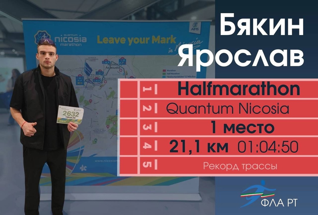 Спортсмен из Казани Ярослав Бякин одержал победу на международном полумарафоне Halfmarathon Quantum Nicosia 2024, который прошел в Никосии. Об этом сообщили в комитете физкультуры и спорта Казани.
