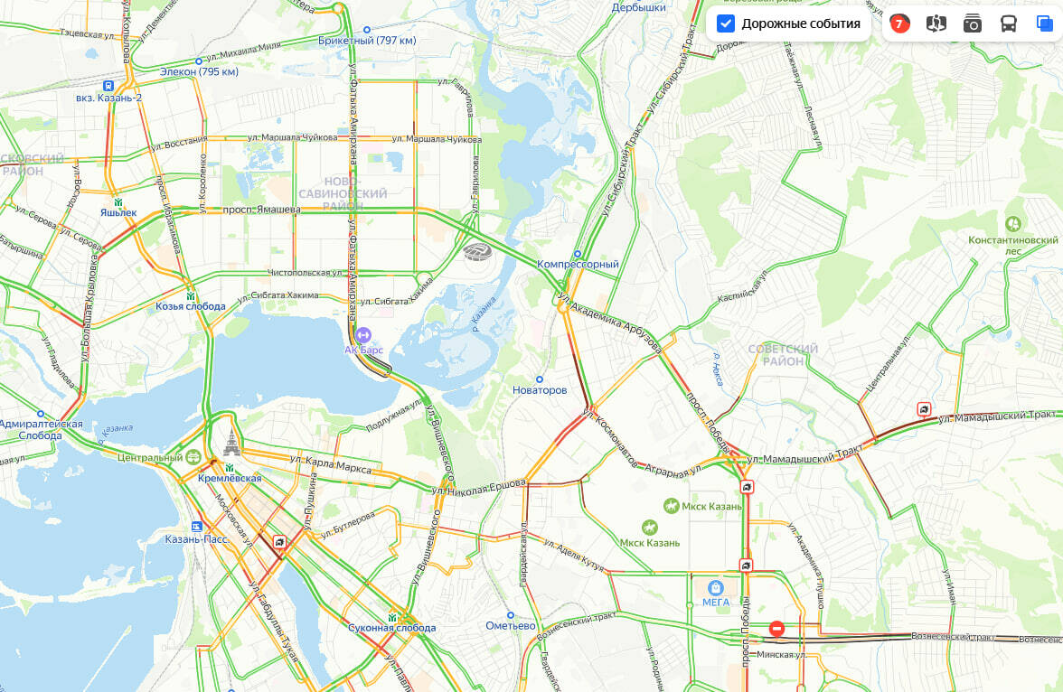 В Казани утром 16 декабря зафиксированы пробки на уровне 7 баллов. Об этом свидетельствуют данные «Яндекс.Карт».