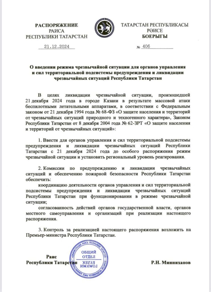 Раис Республики Татарстан Рустам Минниханов подписал распоряжение, вводящее режим чрезвычайной ситуации для органов власти и подразделений Министерства по чрезвычайным ситуациям (МЧС) в связи с необходимостью оперативного реагирования на последствия атаки БПЛА в Казани.