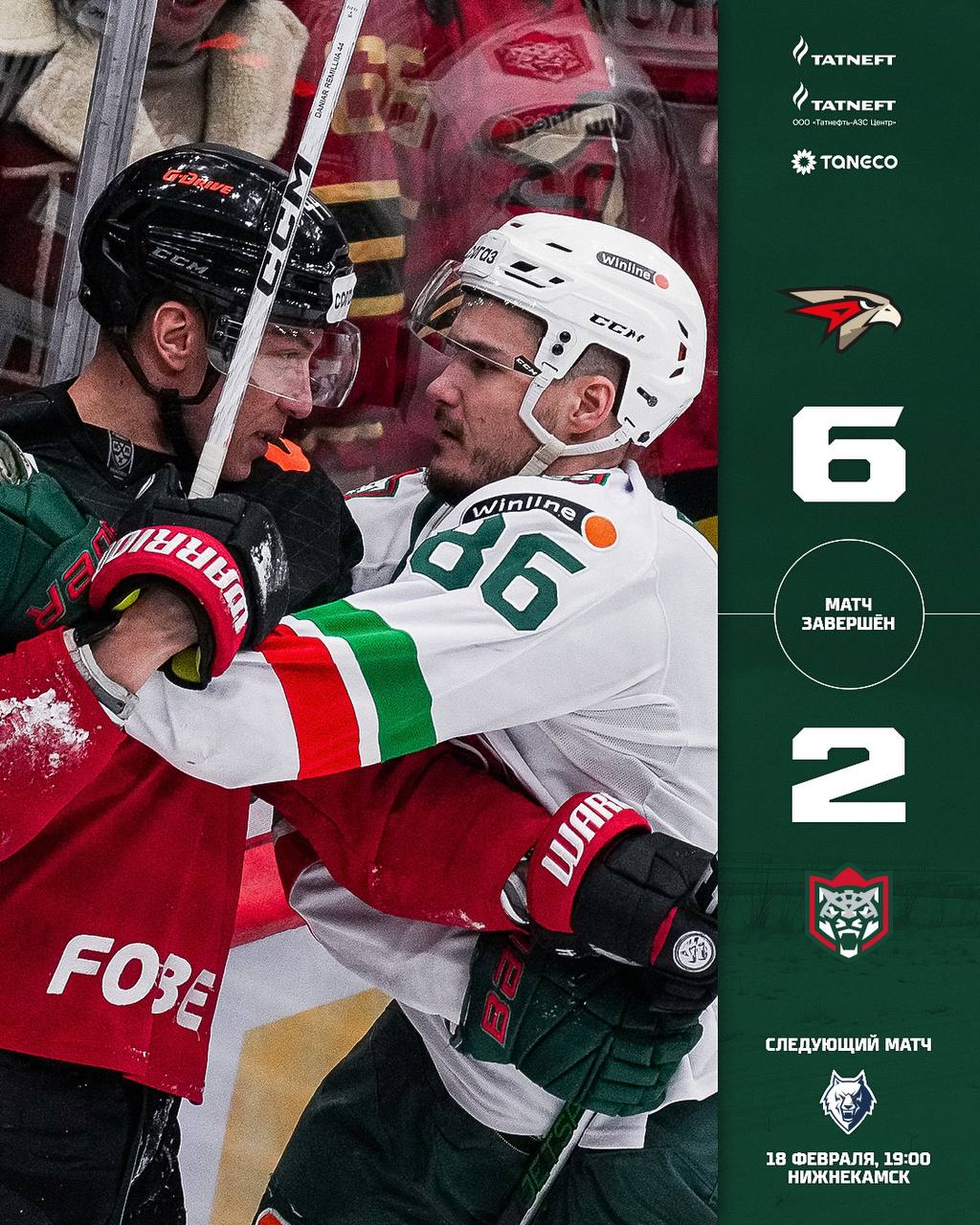 Следующий матч «Ак Барс» сыграет против нижнекамского «Нефтехимика» 18 февраля.