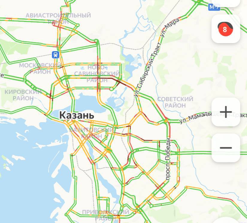 На дорогах Казани образовались 8-балльные пробки, сообщает сервис «Яндекс Карты». Заторы вызваны ДТП, произошедшими в разных районах города.