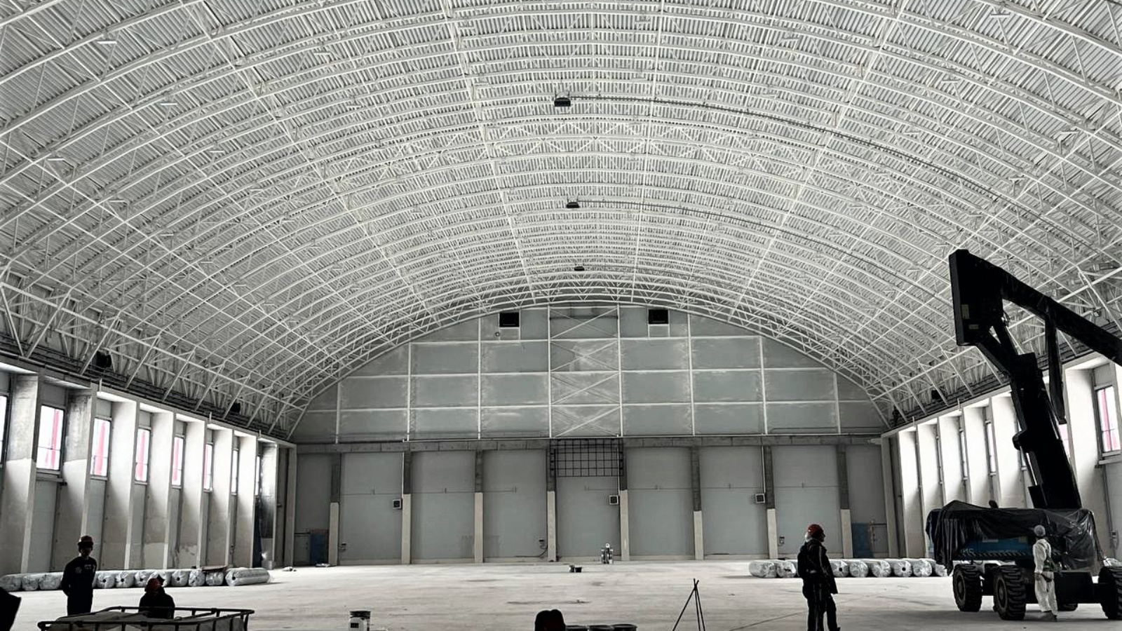 Строительство манежа завершено на 84%. Рабочие заканчивают монтаж инженерных сетей, наружного освещения, прокладку канализации и электричества. Параллельно идет отделка стен и потолков и благоустройство территории.