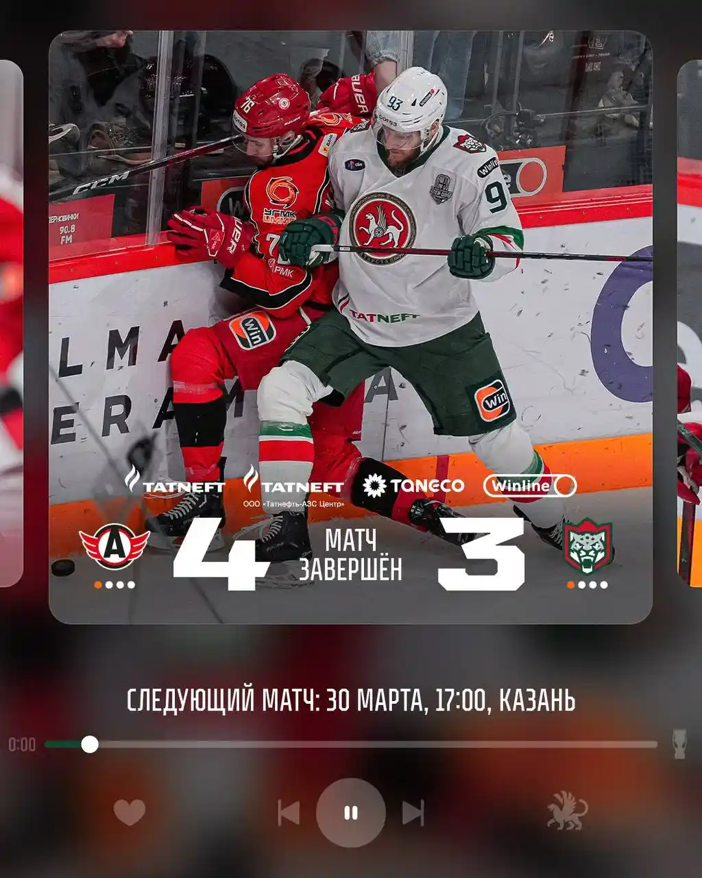 ХК «Ак Барс» потерпел поражение от «Автомобилиста» со счетом 3:4 во втором матче первого раунда плей-офф.