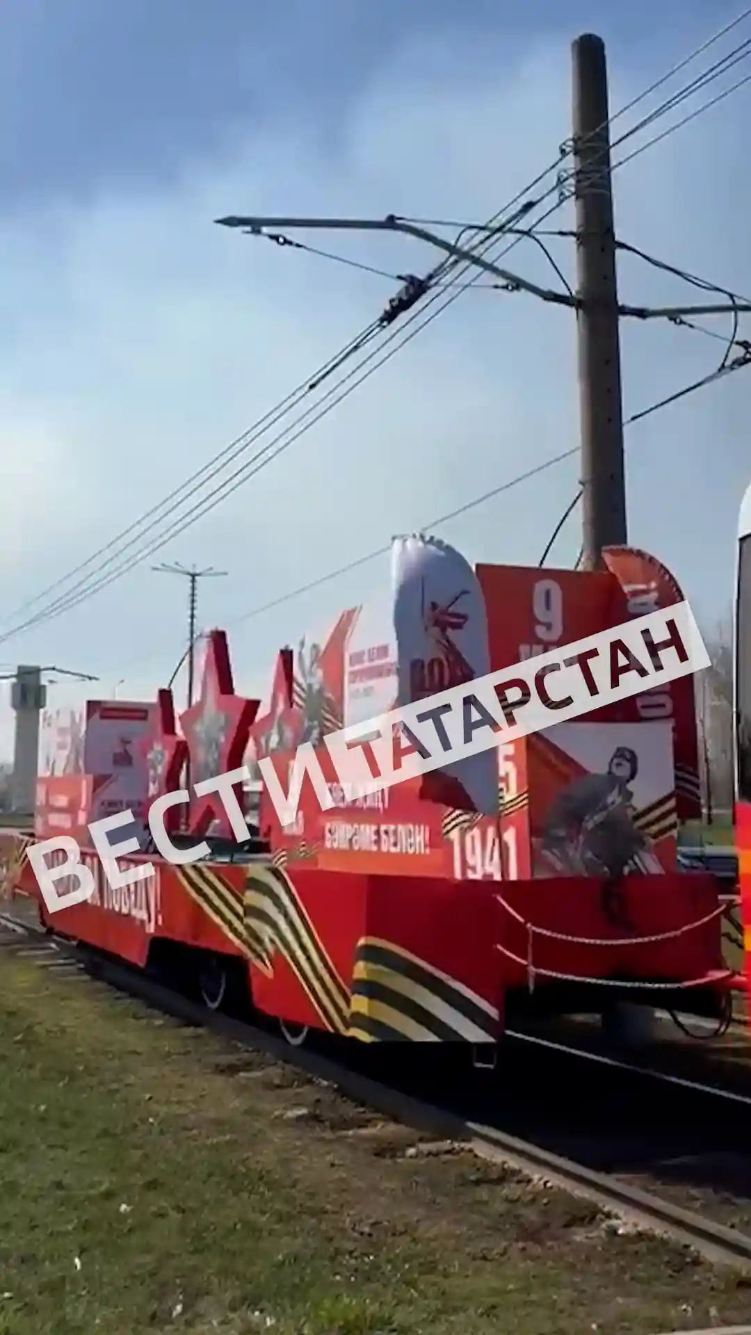 В преддверии Дня Победы в Нижнекамске на линию вышел трамвай, украшенный в честь знаменательной даты. К трамваю присоединена тематическая платформа, оформленная звездами, памятными датами и георгиевскими лентами.