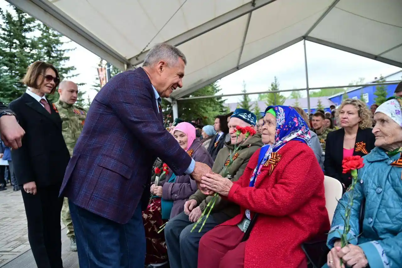 Перед началом мероприятия Рустам Минниханов подошел, чтобы поприветствовать ветеранов, приглашенных на акцию в качестве почетных гостей.