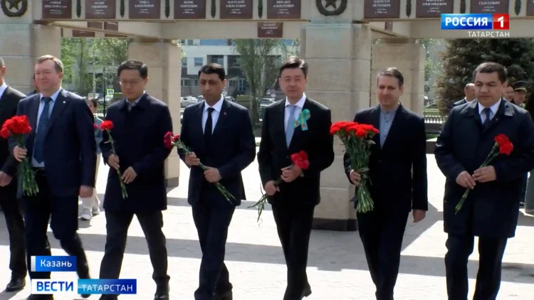 Генконсул Казахстана в Казани Ерлан Искаков и делегация страны торжесвенно возложили цветы к Вечному огню у колоннады Мемориала Славы в парке Победы.