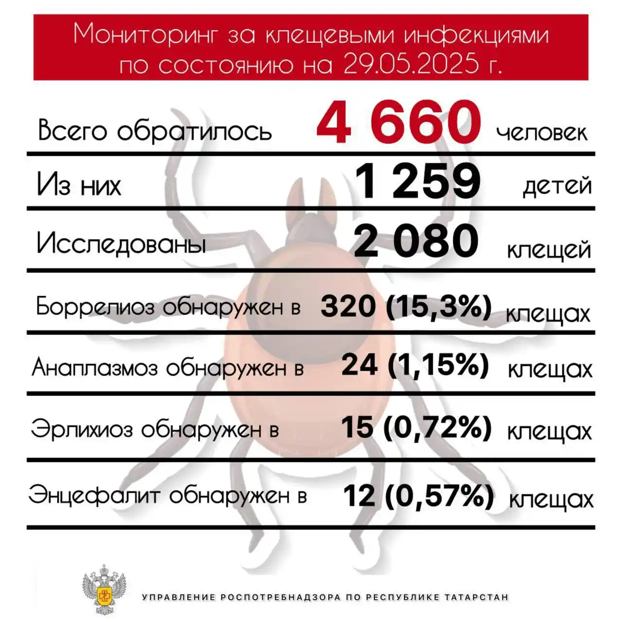Также был зафиксирован первый случай иксодового клещевого боррелиоза у жителя Набережных Челнов, укушенного клещом в лесу Нижнекамского района.