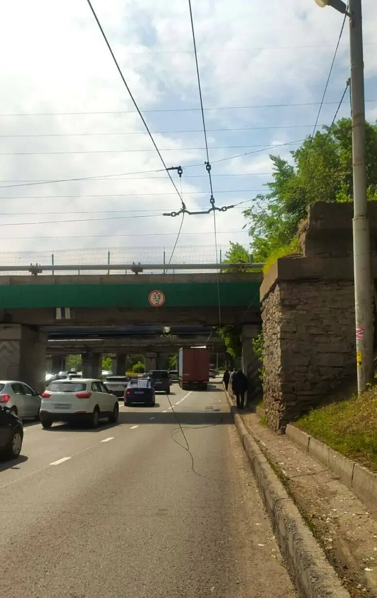 По информации МУП «Метроэлектротранс», провод под мостами на улице Воровского повредил крупногабаритный транспорт сторонней организации.