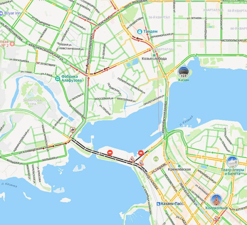 Из-за перекрытия Кировской дамбы в Казани затруднено движение на улицах Вахитова и Декабристов. Об этом свидетельствуют данные сервиса «Яндекс Карты».