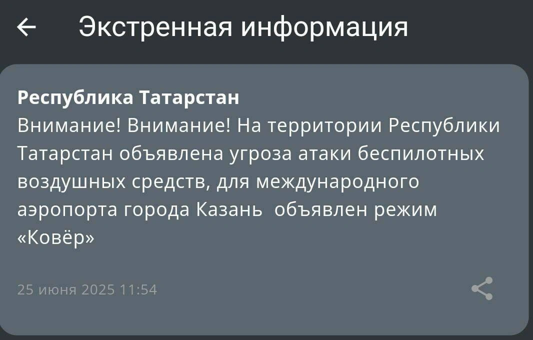 В Татарстане объявили угрозу атаки беспилотников — в аэропорту Казани введен режим «Ковер». Об этом сообщается в мобильном приложении МЧС.