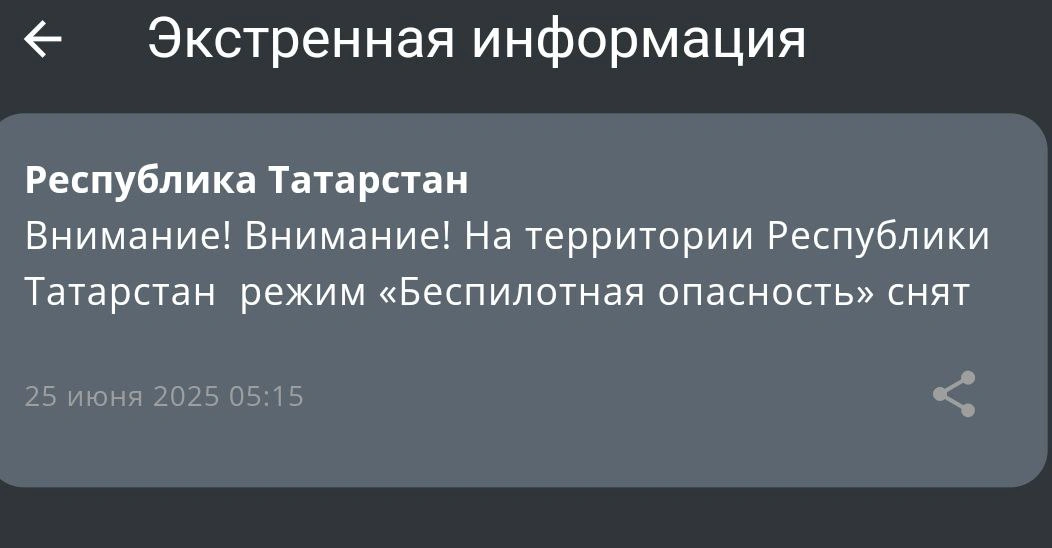 В Татарстане в 5:15 мск отменили режим «Беспилотная опасность», введенный накануне в 11:08. Об этом сообщили в приложении МЧС России.