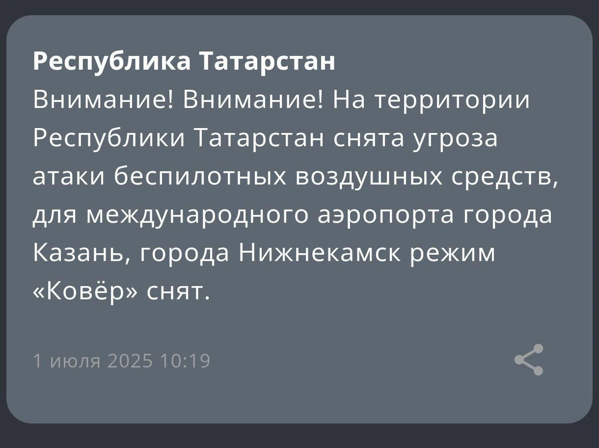 В Татарстане в 10:19 отменили режим «Беспилотная опасность», введенный ранее сегодня в 04:49. Об этом сообщили в приложении МЧС.