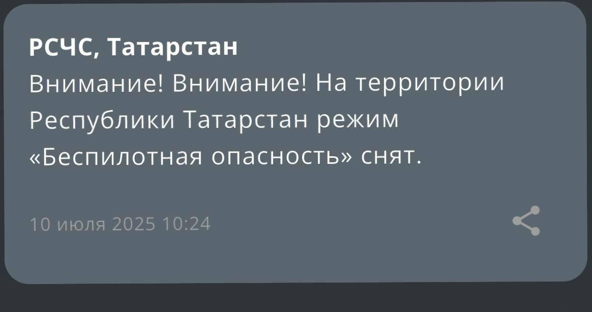 «Внимание! Внимание! На территории Республики Татарстан режим „Беспилотная опасность“ снят», – говорится в сообщении.