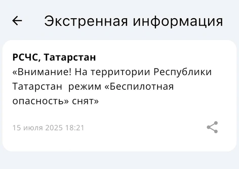 В Татарстане отменен режим «беспилотной опасности», который действовал с 3:46 по московскому времени. Об этом сообщает МЧС России по РТ.