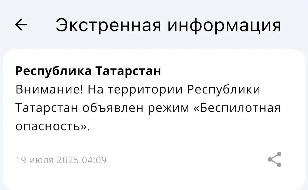 «Внимание! На территории Республики Татарстан объявлен режим «Беспилотная опасность», – сказано в сообщении ведомства.