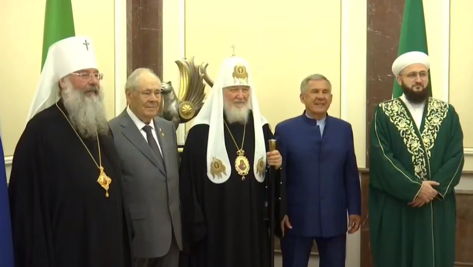 «Встретились в Казанском Кремле с Патриархом Московским и всея Руси Кириллом. Минтимер Шарипович тоже с нами!» — написал Минниханов.
