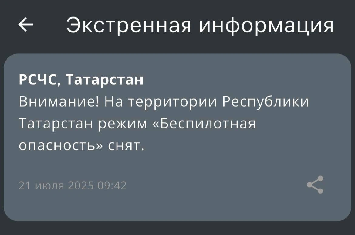 В Татарстане отменили режим беспилотной угрозы. Об этом сообщили в МЧС России через официальное приложение в 09:42 по московскому времени.