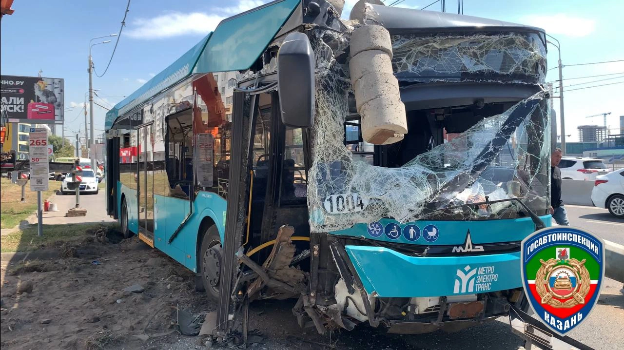 Опубликовали видео момента аварии с троллейбусом, который сегодня днем в Казани врезался в фонарный столб.
