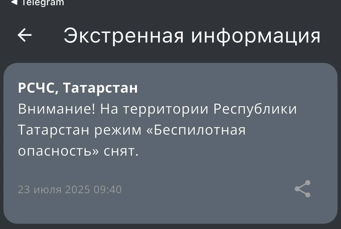 В Татарстане в 09:40 был отменен режим «Беспилотная опасность». Об этом сообщили в официальном приложении МЧС.