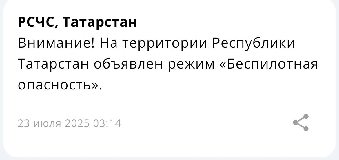 «Внимание! На территории Республики Татарстан объявлен режим «Беспилотная опасность», – сказано в сообщении ведомства.