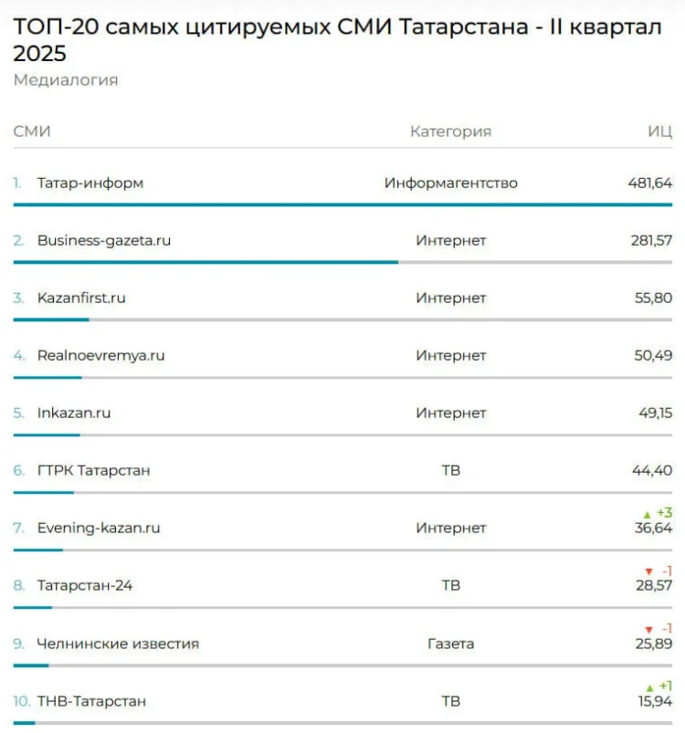 ГТРК Татарстан заняла шестое место в рейтинге самых цитируемых СМИ республики за второй квартал 2025 года. Рейтинг составила компания «Медиалогия».