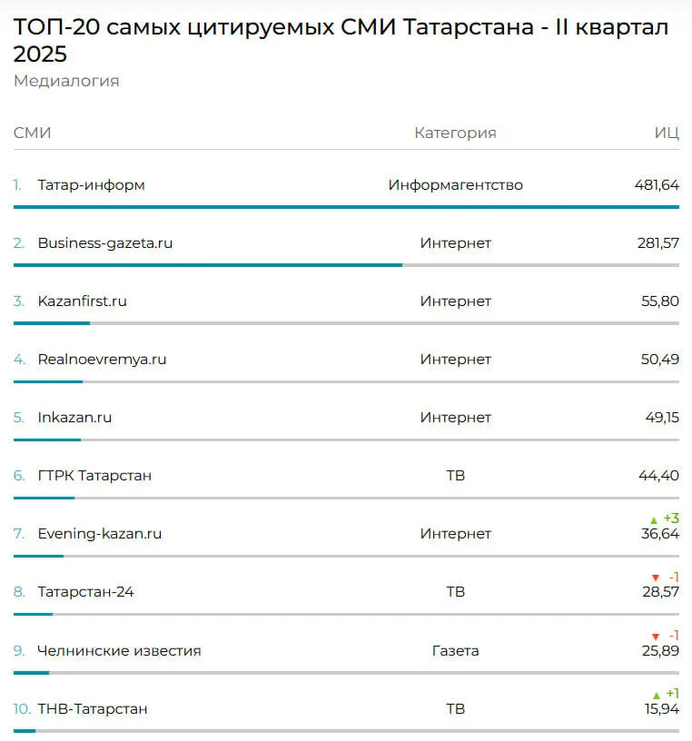 В общий список вошли 20 медиаорганизаций Татарстана, рейтинг был основан на Индексе Цитируемости, где ГТРК Татарстан продемонстрировала результат в 44,40.