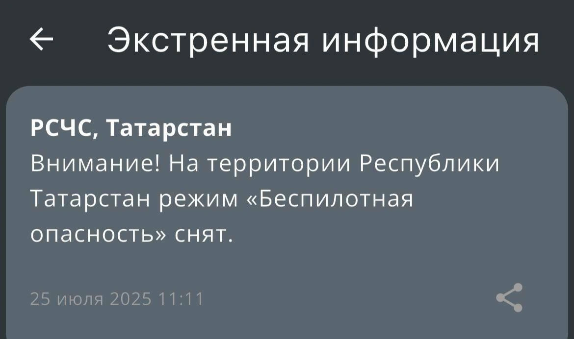 В Татарстане в 11:11 отменили режим «Беспилотная опасность». Об этом сообщили в официальном приложении МЧС.