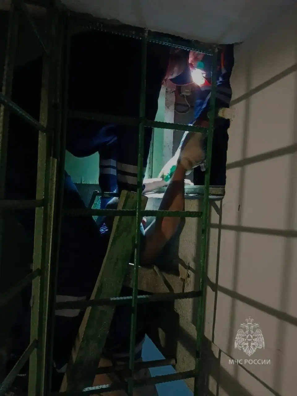 Спасатели использовали гидравлический аварийно-спасательный инструмент для раздвижения лестничной конструкции, после чего успешно извлекли мужчину и передали его в руки медиков и правоохранительных органов.