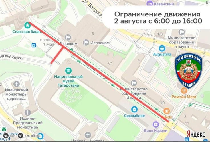 Движение ограничат на парковке у площади 1 Мая (ул. Кремлевская со стороны Ивановского спуска) и на участке от пересечения улиц Чернышевского и Кремлевская до Спасской башни на площади 1 Мая.