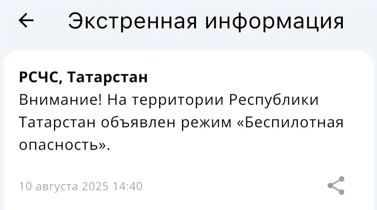 «На территории Республики Татарстан объявлен режим «Беспилотная опасность»», – говорится в официальном приложении.