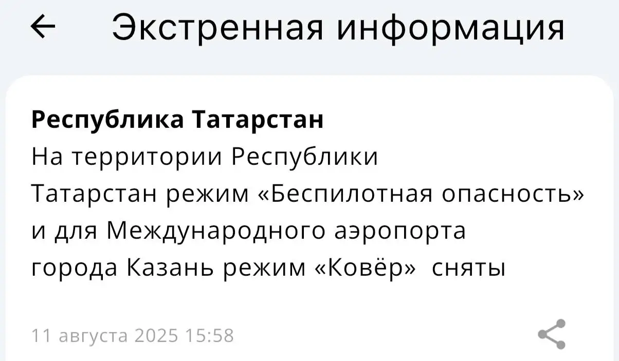 «На территории Республики Татарстан режим „Беспилотная опасность“ и для Международного аэропорта города Казань режим «Ковер» сняты», — отметили в ведомстве.