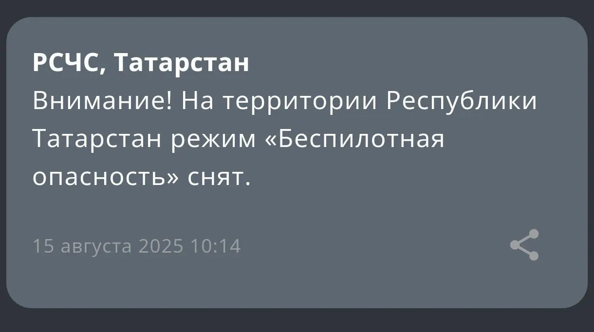 «Внимание! На территории Республики Татарстан режим „Беспилотная опасность“ снят», – говорится в официальном приложении.