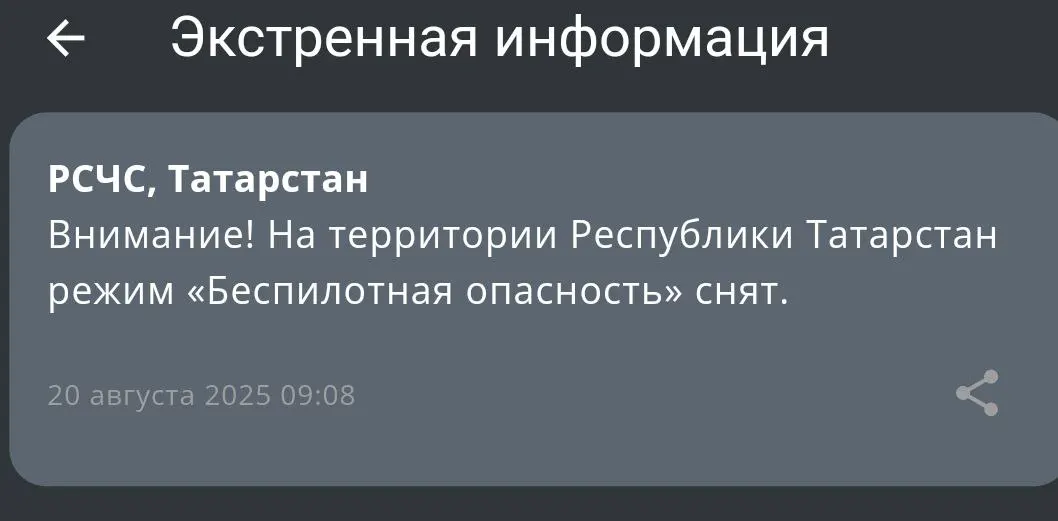 «Внимание! На территории Республики Татарстан режим „Беспилотная опасность“ снят», – говорится в официальном приложении.