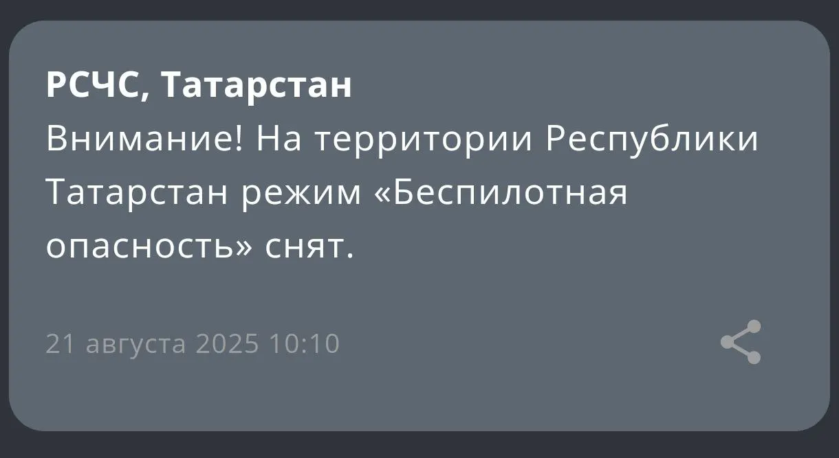 В Татарстане отменили режим беспилотной опасности спустя 6 часов. Об этом сообщили в официальном приложении МЧС.