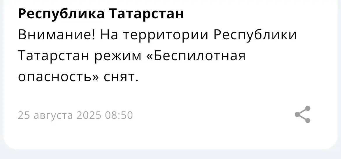 В Татарстане отменили режим «Беспилотная опасность». Об этом МЧС России сообщило в своем приложении в 08:50 по московскому времени.