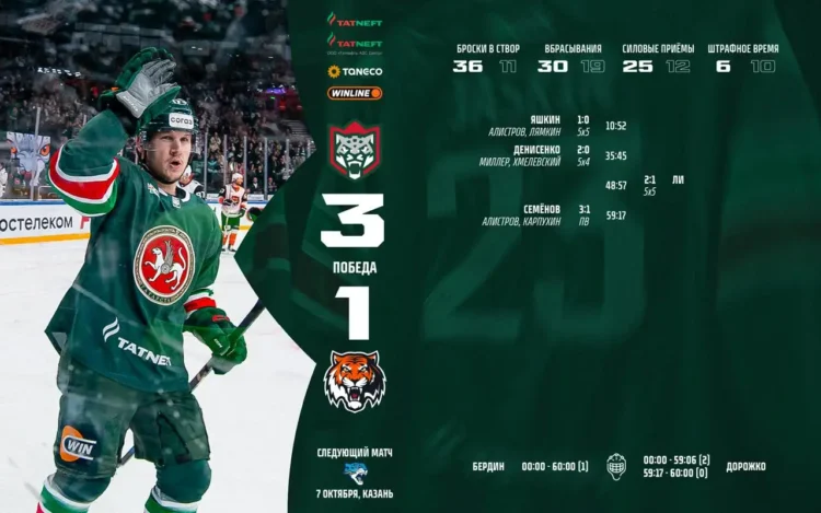 Эта победа позволила «Ак Барсу» заработать 13 очков и подняться на шестую позицию в таблице Восточной конференции КХЛ.