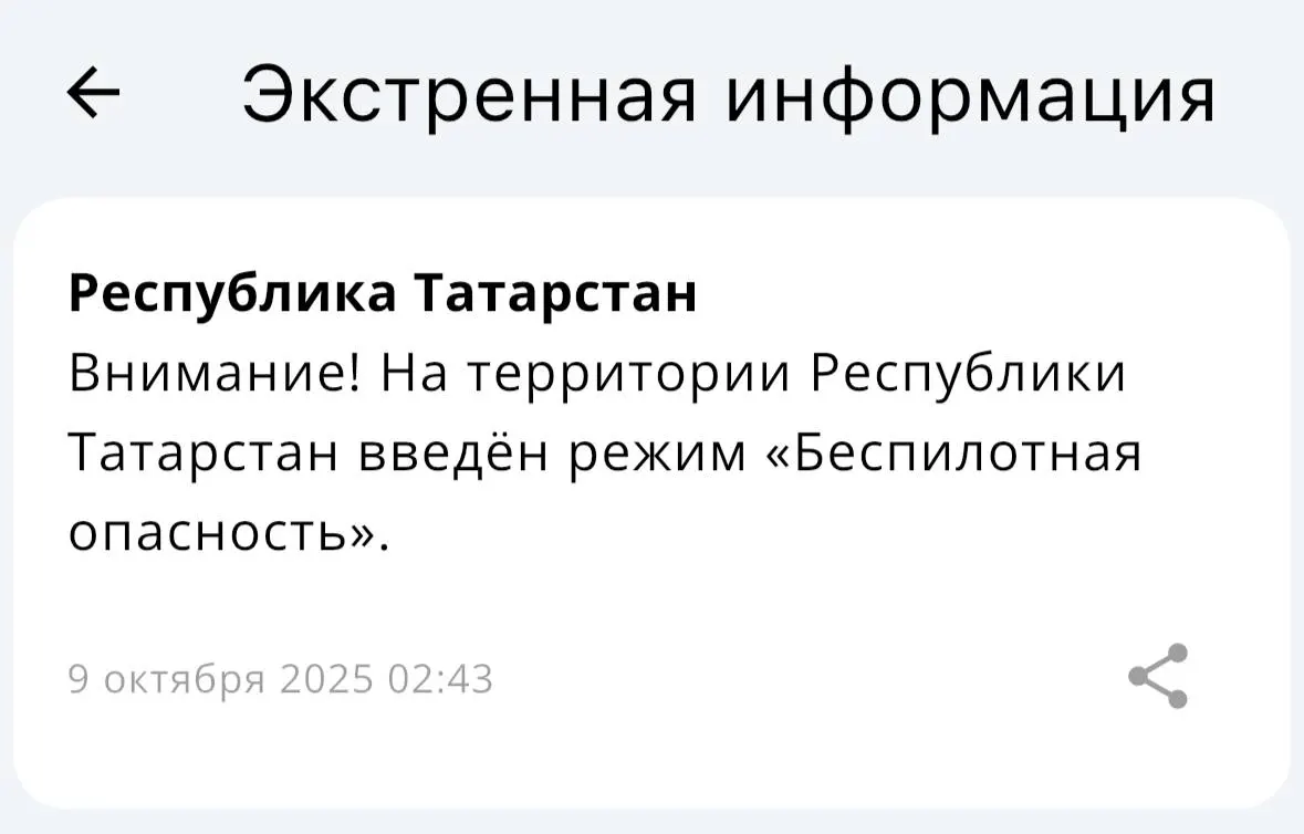 На территории Татарстана с 02:43 по московскому времени введен режим беспилотной опасности, сообщает МЧС России в своем приложении.
