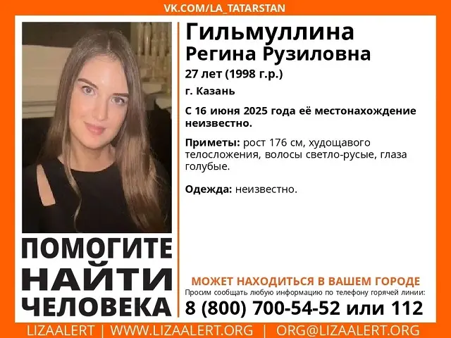 В Казани разыскивают 27-летнюю Регину Гильмуллину, пропавшую 16 июня, сообщили волонтеры поискового отряда «Лиза Алерт».