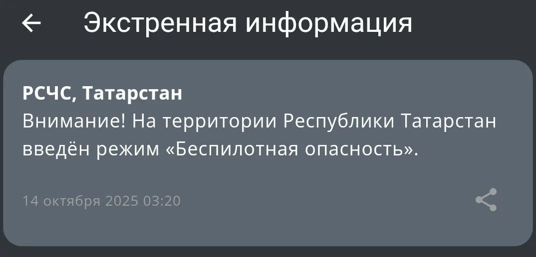В Татарстане с 03:20 по московскому времени введен режим беспилотной опасности. Об этом сообщили в мобильном приложении МЧС России.