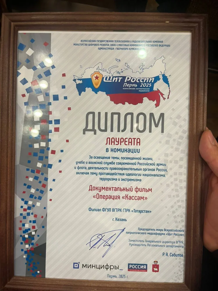 ГТРК «Татарстан» стала лауреатом с документальным фильмом «Операция «Кассам»» в номинации за освещение темы, посвященной жизни, учебе и воинской службе современной Российской армии и флота, деятельности правоохранительных органов России, включая тему противодействия идеологии национализма, терроризма и экстремизма.