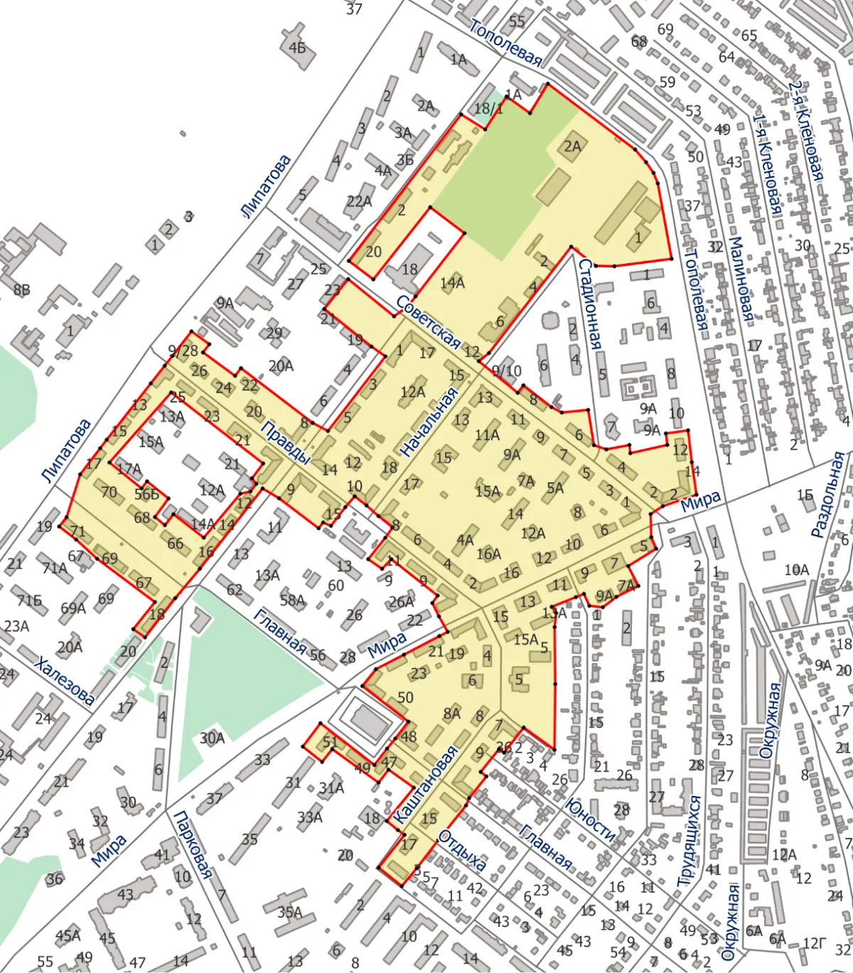 Речь идет о территории, которая с юго-запада ограничена улицами Халезова и Парковой, с юго-востока — улицами Каштановой и Мира (с небольшим заходом на внутридворовые участки), с северо-востока — улицей Тополевой, а с северо-запада — улицей Липатова.
