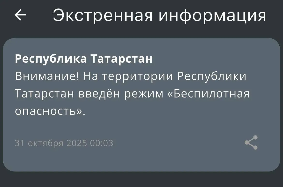 В Татарстане в 00:03 ввели режим беспилотной опасности. Об этом сообщили в официальном приложении МЧС России.