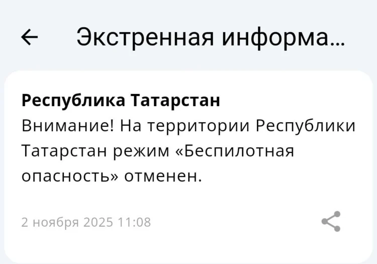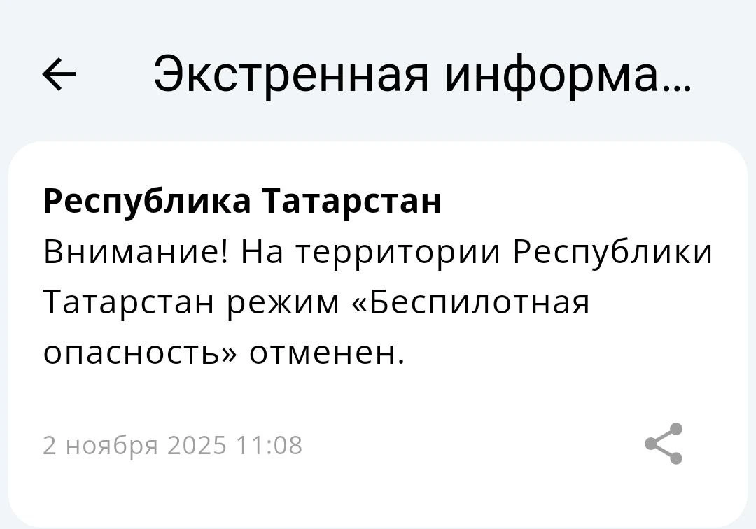 На территории Республики Татарстан спустя девять часов сняли режим «Беспилотная опасность». Об этом сообщили ы официальном приложении МЧС.